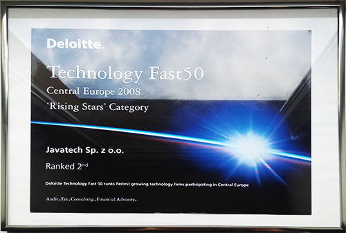 Javatech znalazł się na 2. miejscu (1. miejsce z firm polskich!) w tegorocznej edycji rankingu Deloitte Fast 50 Central Europe (kategoria “Rising Stars”) z wynikiem 862% wzrostu w latach 2005-2007!